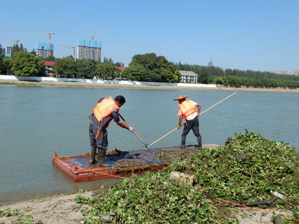近日,秦淮新河水利枢纽上游侧河面出现大面积水草,堵塞河道,影响河道行洪安全。为保证水利工程安全运行,新河所联合属地南京市雨花台区天后社区开展水草打捞工作。